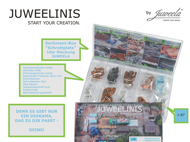 Sortimentbox Startset Schrottplatz, 10x Juweelinis, Spur H0, 1:87 für Modelleisenbahn, Modellbau, Diorama