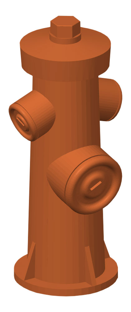 Nachbildung Löschwasser Überflurhydrant mit zwei leicht nach unten geneigten Abgängen der Schlauchgröße B sowie einem Sechseck-Verschluss auf der Oberseite zum Öffnen der Wasserzufuhr.