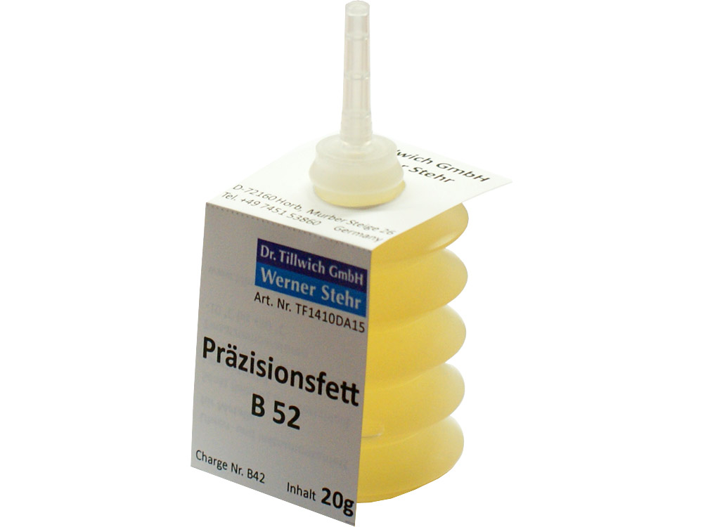 Präzisionsfett B 52 der Dr. Tillwich GmbH, identisch mit Lokfett B 52 (ohne Ölgeber und Sonnenblumenmark), Metallseifenfett mit sehr weicher Konsistenz, gute Haftfähigkeit, sehr hoher Lebensdauer, verharzungsstabil, säurefrei.