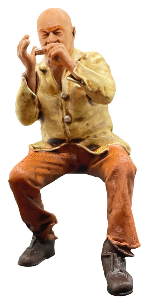 Musiker Gustav mit Mundharmonika, Modellbahnfigur handbemalt, Spur 0 (Null), 1:45 für Modelleisenbahn, Modellbau, Diorama