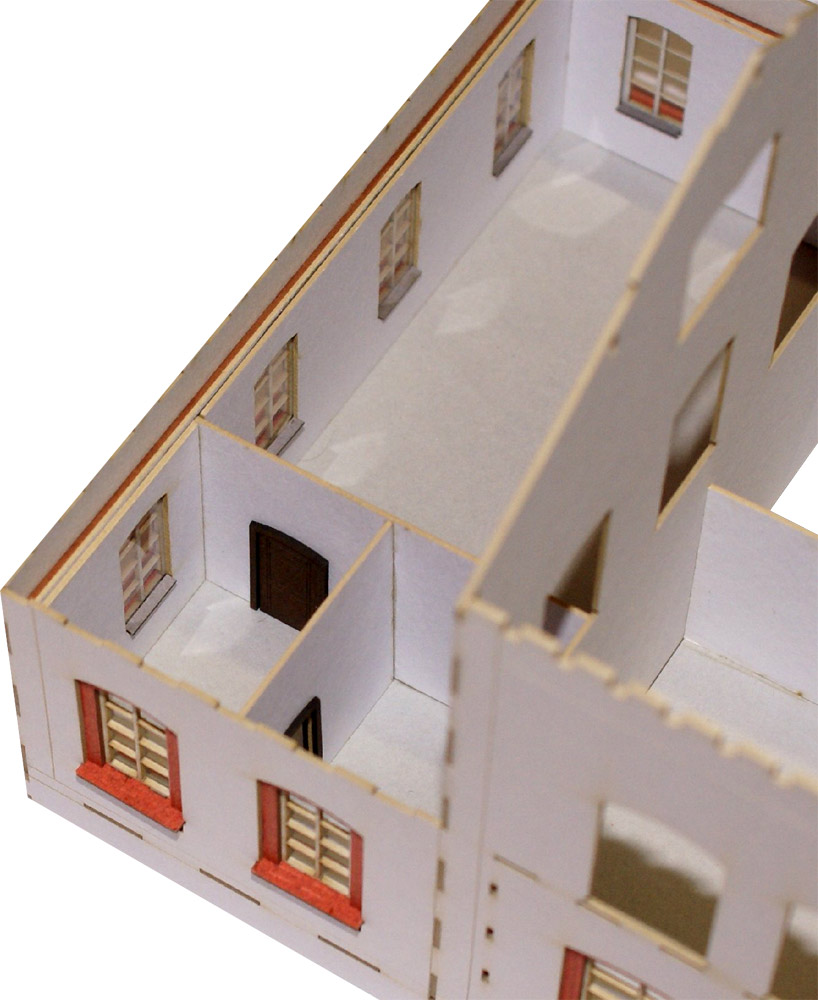 Bei diesem Modell wurden teilweise auch innen Fensterbänke nachempfunden. Zur weiteren Ausgestaltung liegen dem Bausatz 24 Zimmertüren mit Rahmen bei.