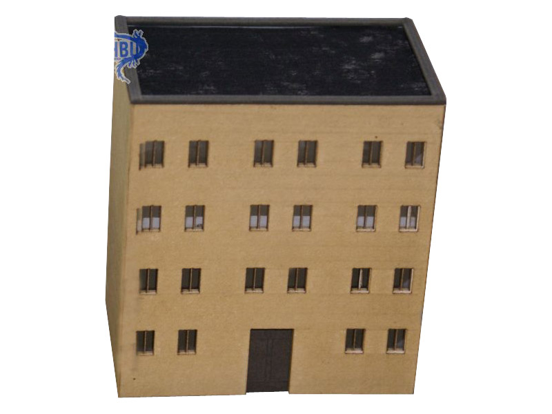 Das Stadthaus 4 hat einen Zwischenboden. Das Teerpappedach ist nicht gealtert worden, so wie auch das Haus selbst nicht farblich nachbehandelt wurde. Auf der Vorderseite befinden sich kleine Verzierungen auf dem Mauerwerk. Die Bilder zeigen das Fertigmodell wie es aus dem Bausatz gebaut werden kann.