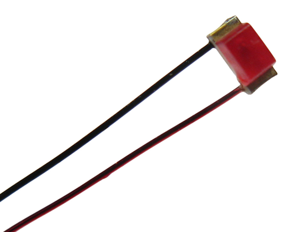 Diese sind fertig verlötet mit 0,15 mm dünnen und isoliertem Kupferlackdraht. Das Gehäuse bzw. die Linse der Leuchtdiode ist diffus rot eingefärbt.
